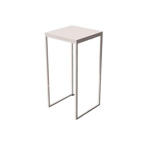 Tavolino alto con ripiano in nobilitato e gambe verniciate in metallo a sezione rettangolare.