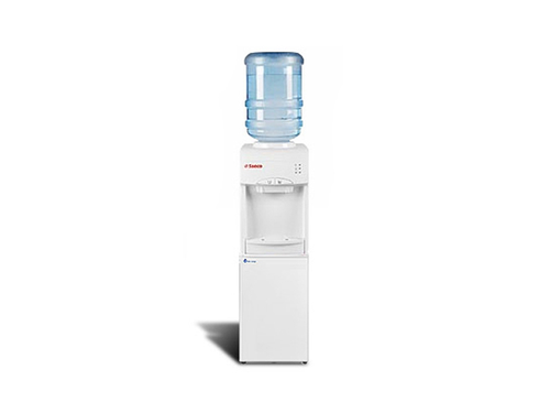 Dispenser che eroga acqua a temperatura ambiente e refrigerata; la fontanella viene ricaricata tramite boccioni sostituibili con capienza di 19 litri ciascuno. Dimensioni: H. 104cm L. 35.5 cm P. 37.8 cm
